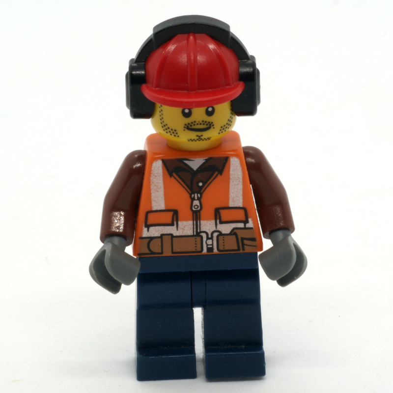 Construction Worker, Orange Safety Vest with Zipper and Pockets, Red Hard Hat with Ear Defenders, Stubble