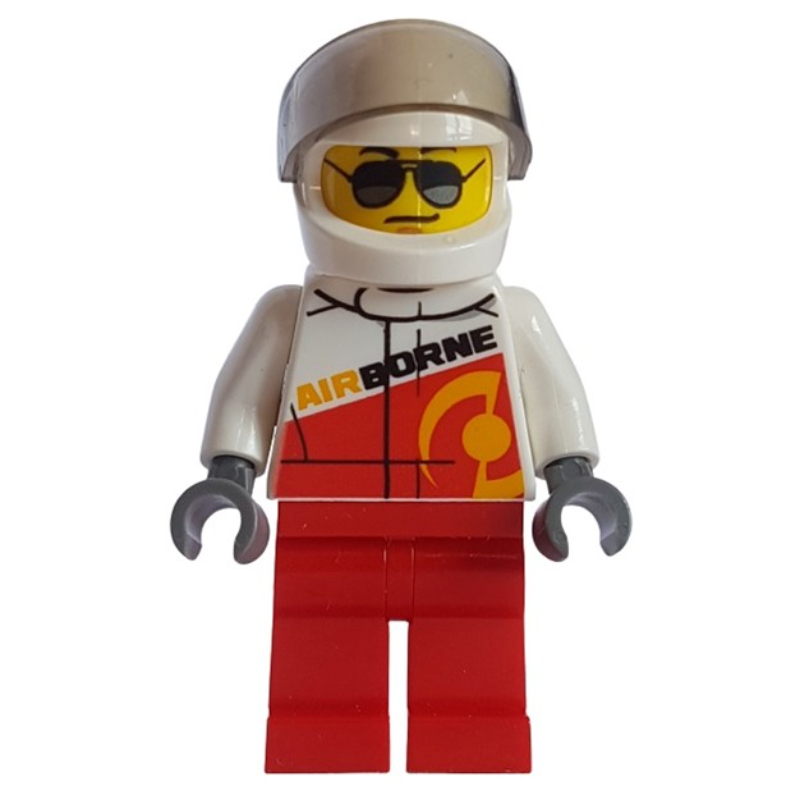 Racer, Red and White Jumpsuit with 'AIRBORNE', White Helmet with Visor, Sunglasses